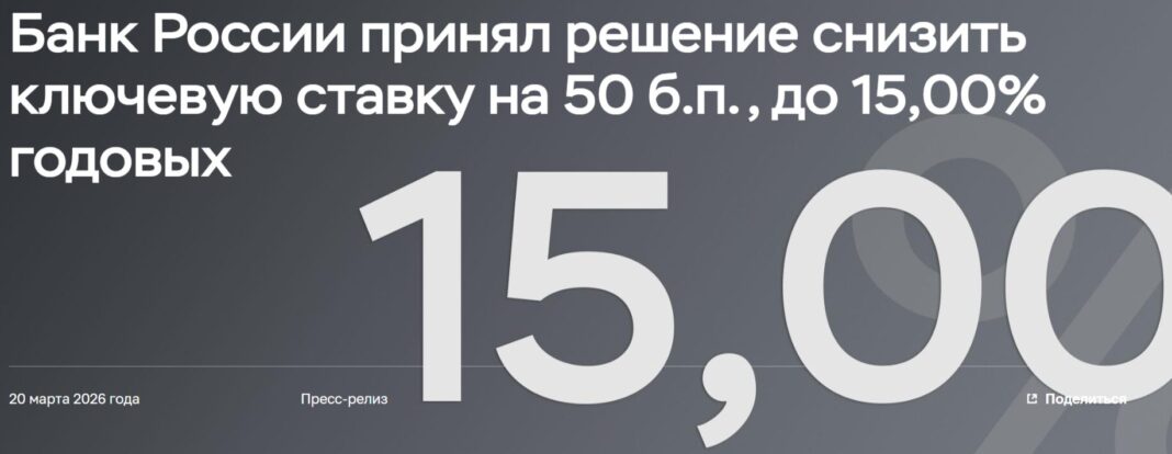 ЦБ России седьмой раз подряд снизил ключевую ставку — до 15%.