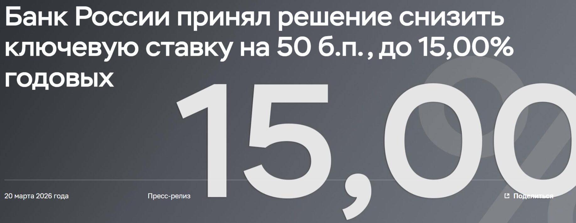ЦБ понизил ключевую ставку с 15,5% до 15%. Ставка упала с 15,5% впервые с 2023 года.
