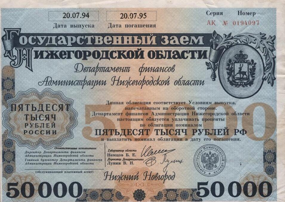 Иллюстрация – облигация государственного заема Нижегородской области 1994 года